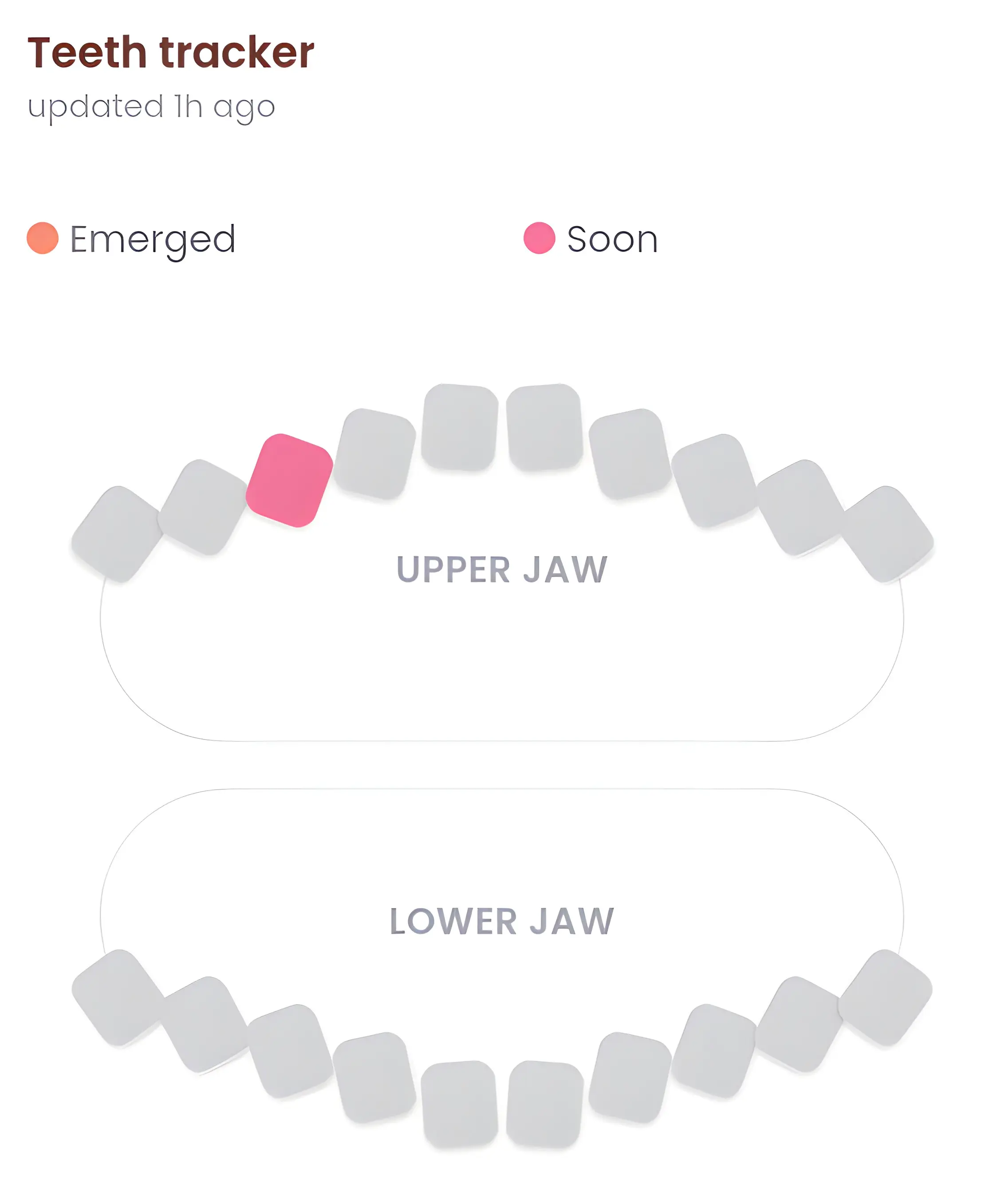 Why Tracking Status Helps: Without a clear record, it’s easy to lose track of exactly when you first noticed signs of teething or when a tooth actually broke through. By simply logging the status change from "None" to "Coming Soon" and finally to "Emerged", you create an accurate timeline. This data is invaluable during pediatric visits, allowing doctors to assess whether your child’s development falls within healthy parameters or requires further investigation.
